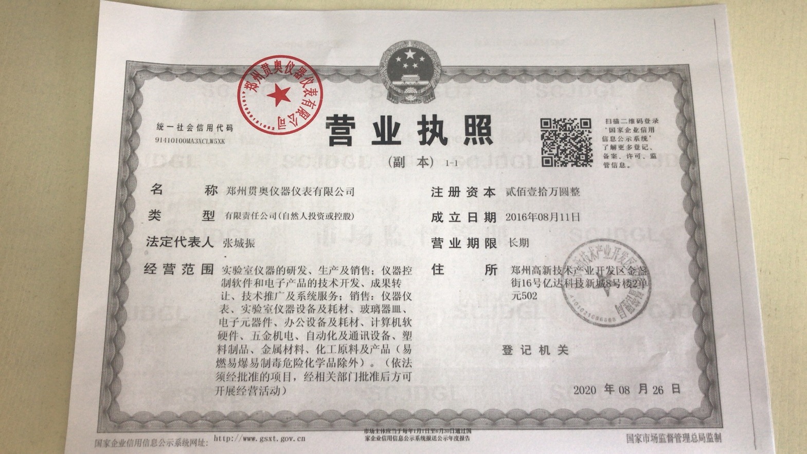 鄭州貫奧儀器儀表有限公司營業執照