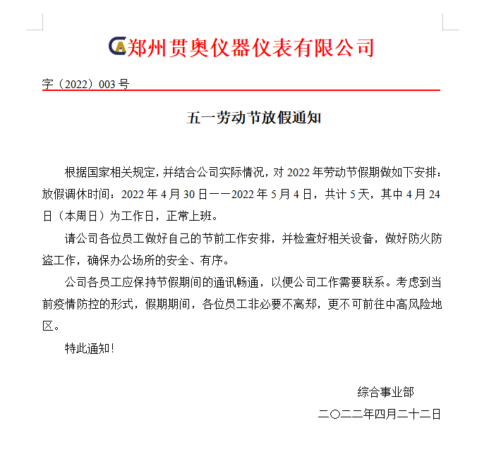 鄭州貫奧儀器儀表有限公司2022年五一勞動節放假通知