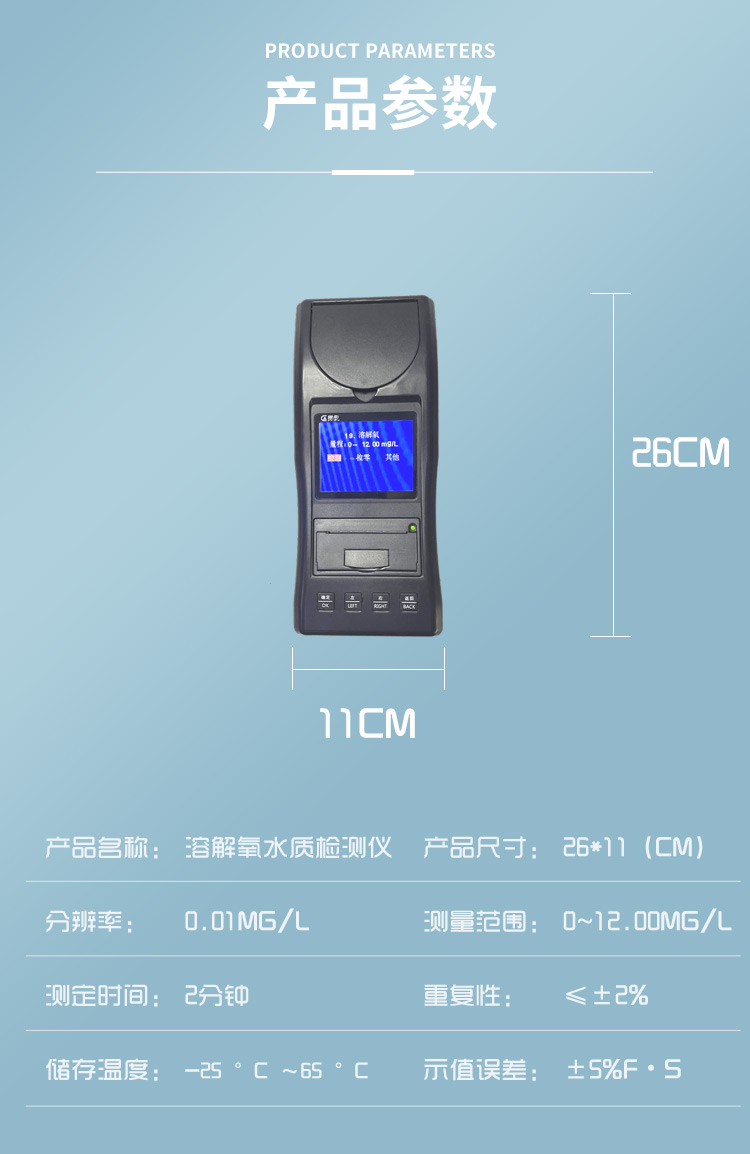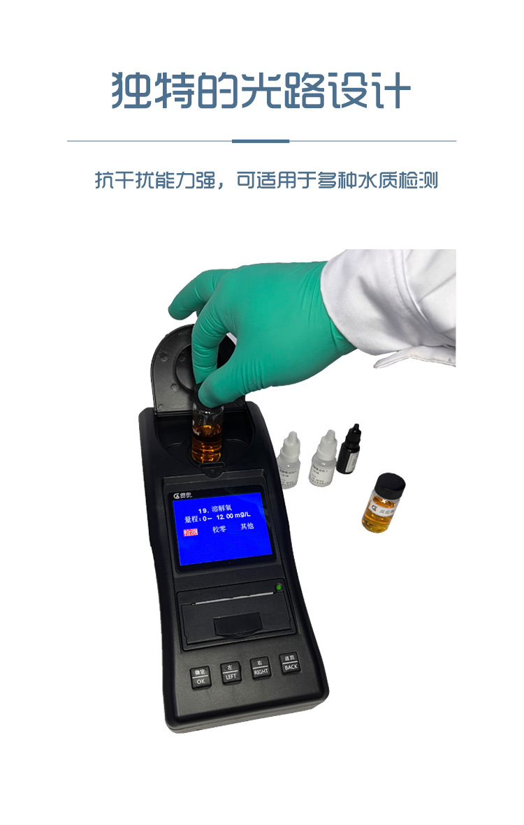 3、溶解氧測試儀采用分光光度的光電比色原理,操作簡便,取水樣放入試劑反應(yīng)幾分鐘即可讀數(shù),重復(fù)性≤±2%。